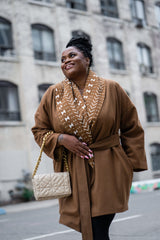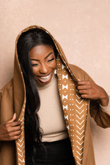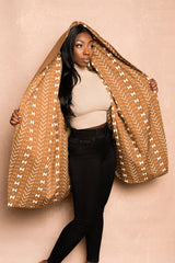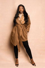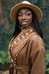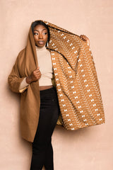 Subtle details elevate Lana mudcloth Print coat to the next level of sophistication and elegance. A classic wardrobe staple, this African print coat is indeed one of a kind and definitely an item you need in your wardrobe. Modern, tailored design combined with the traditional print are the elements that make this coat so special and sought-after. Conveying a sense of effortless chic, you'll want to wear the Lana mudcloth print coat this fall. More than this, the coat features a belt and pockets and comes in a dark beige color, ideal to be styled with black and different shades of brown.